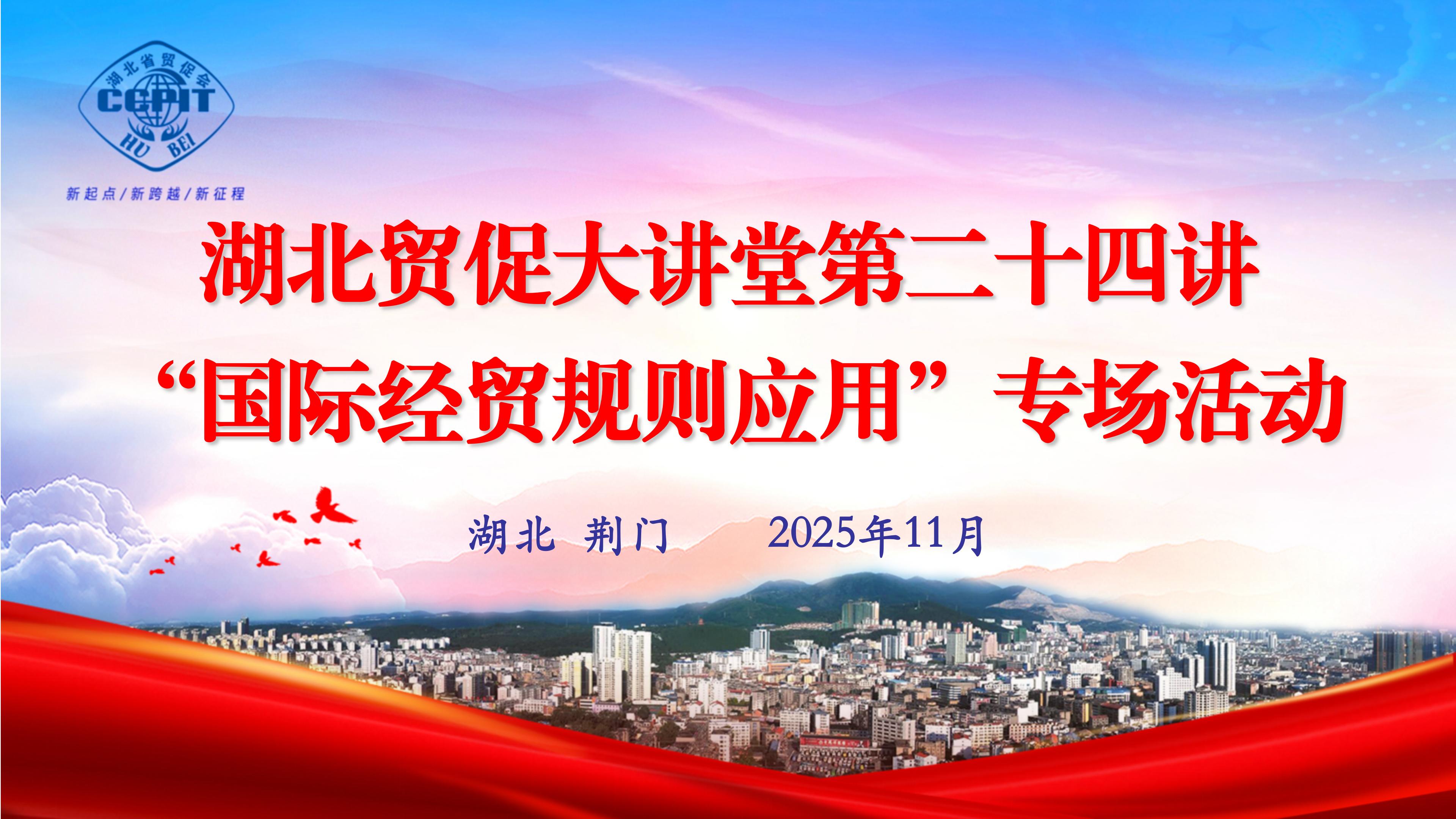 为增强企业和涉外商事法律相关单位应用国际经贸规则的本领,提升企业国际市场竞争软实力和我省涉外商事法律相关部门运用国际规则维护我企业海外安全和发展利益的能力,湖北省贸促会将于11月24日至26日在湖北荆门市举办湖北贸促大讲堂第24讲“国际经贸规则应用”专场。