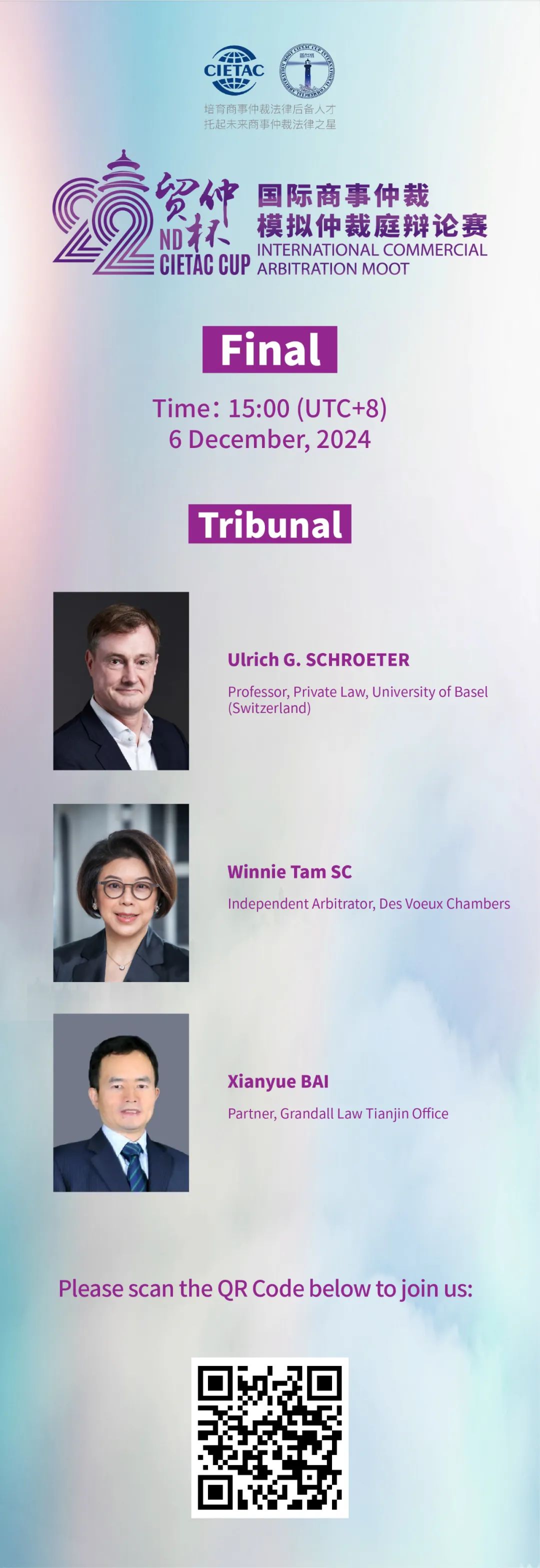 作为中国历史最悠久,影响最广泛的国际商事仲裁模拟仲裁庭辩论赛,第二十二届“贸仲杯”已于2024年11月29日揭开战幕。经过101支参赛队5天216场比赛的激烈角逐,两支脱颖而出的队伍峰顶相会,将展开巅峰对决。决赛将于2024年12月6日(周五)下午15:00时在北京国宾酒店二层国宾厅进行,全程同步直播,欢迎各位上线收看,共襄盛举!