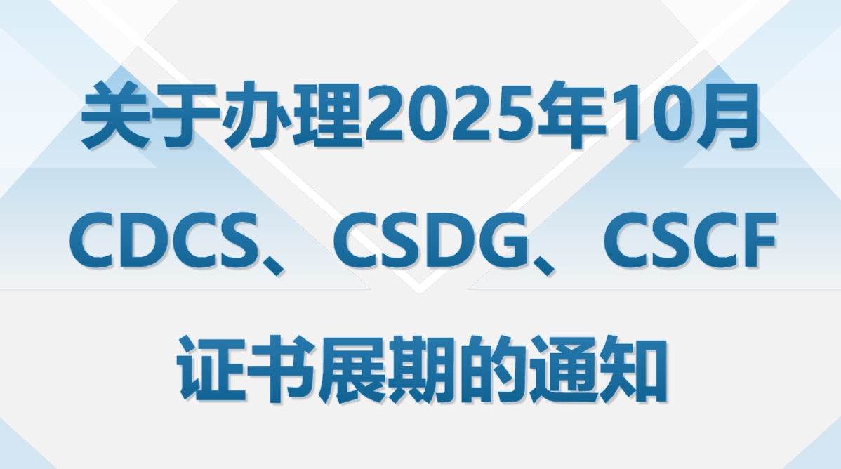 2025年10月期CDCS、CSDG、CSCF证书展期工作将于9月1日开始,至12月31日截止。请需要进行CDCS、CSDG、CSCF证书展期的持证人按照本通知有关要求和说明办理。
