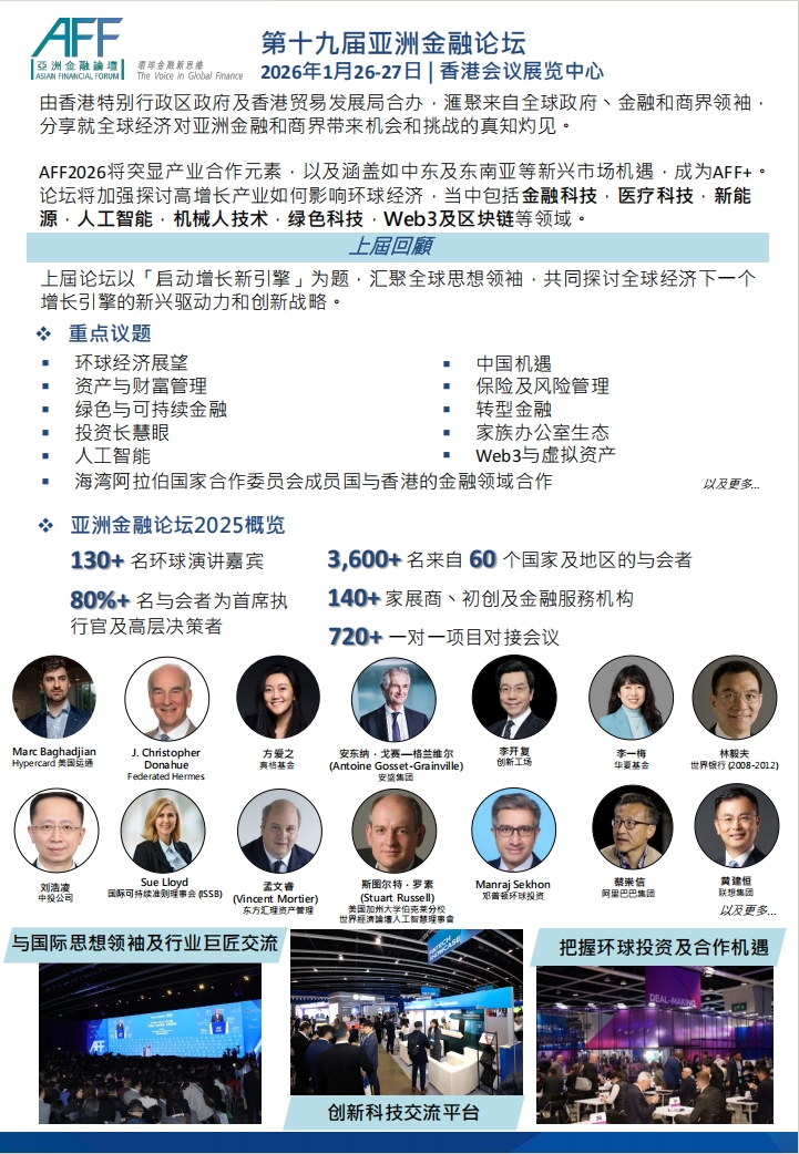第十九届亚洲金融论坛将于2026年1月26日-27日在香港会议展览中心举办,受主办方邀请,我单位将再次组织企事业单位赴香港参加此次论坛,望有关单位积极报名参加。