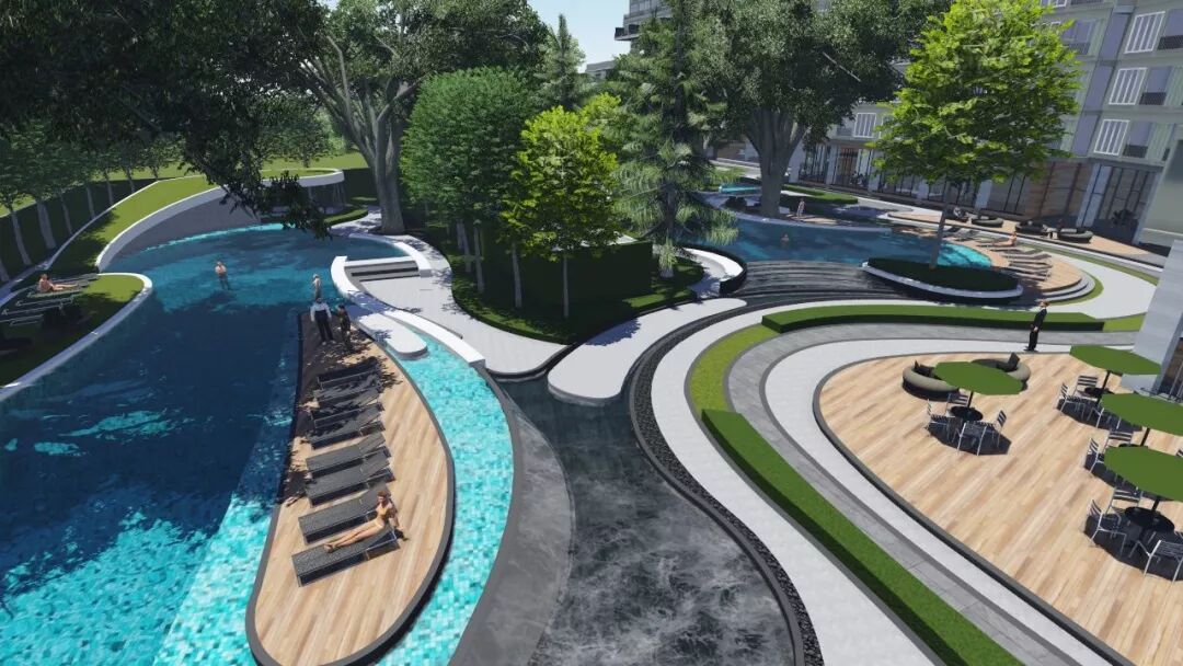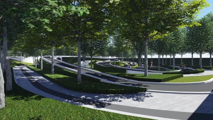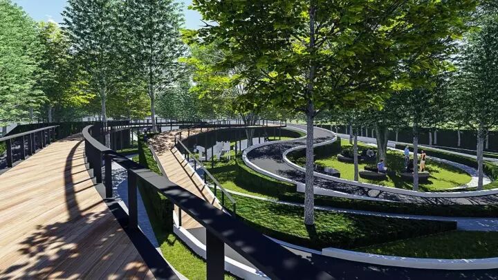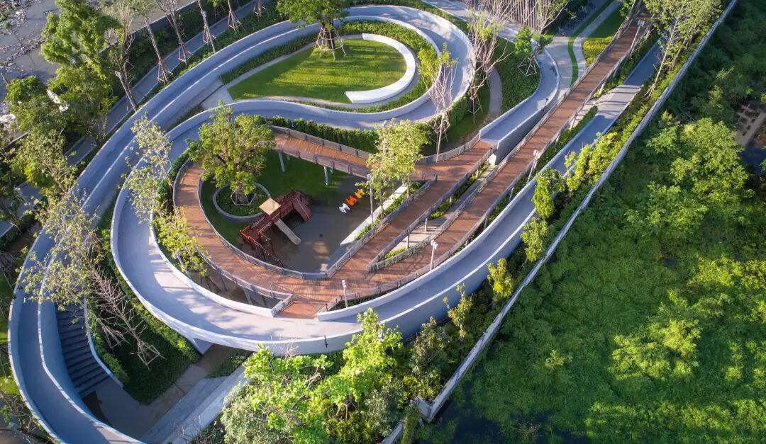 仿真草坪与铺装融入,让大块面的场地显得更加亲人、灵动有生机,起伏变化的运动跑道和木质漫步道,相互交融穿插,让体验感更加丰富有趣。回转漫步道休憩区,木质结合仿真草坪几乎是最佳的亲人材质搭配。